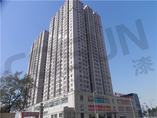 三、外墻真石漆施工要求同批料用在同面墻上,同時還建議同批施工人員進行施工,施工時噴涂要求做到厚薄均勻一致,以防色差出現。